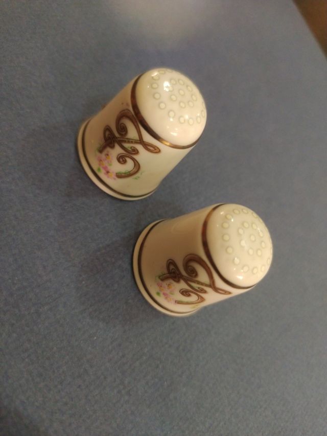 Product detailsPareja de delicados dedales de porcelana. Presentan una bonita decoración con iniciales y flores pintadas a mano. Son ideales para costura o coleccionismo.