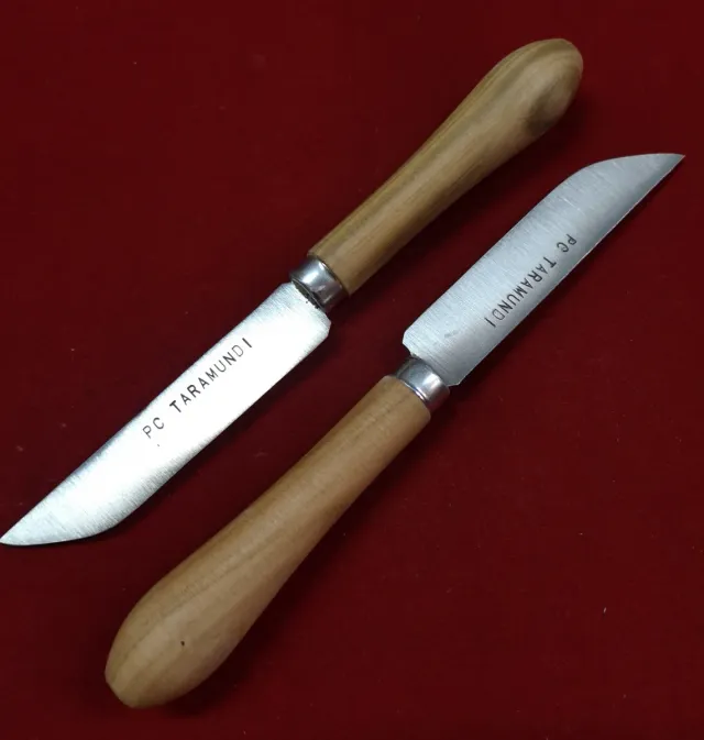 Product detailsDos cuchillos Taramundi de mesa realizados por maestro Artesano Pedro Conde Bermudez, firmado PC en su hoja acero inox FORJADA a mano punta vuelta de 10 cm. Mango en madera de Cerezo tornada. Corta y se afila muy bien. Nueva a estrenar.
