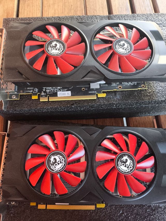 Product detailsSe venden dos tarjetas gráficas SOYO RX 580 con 8GB de VRAM y 2048SP.