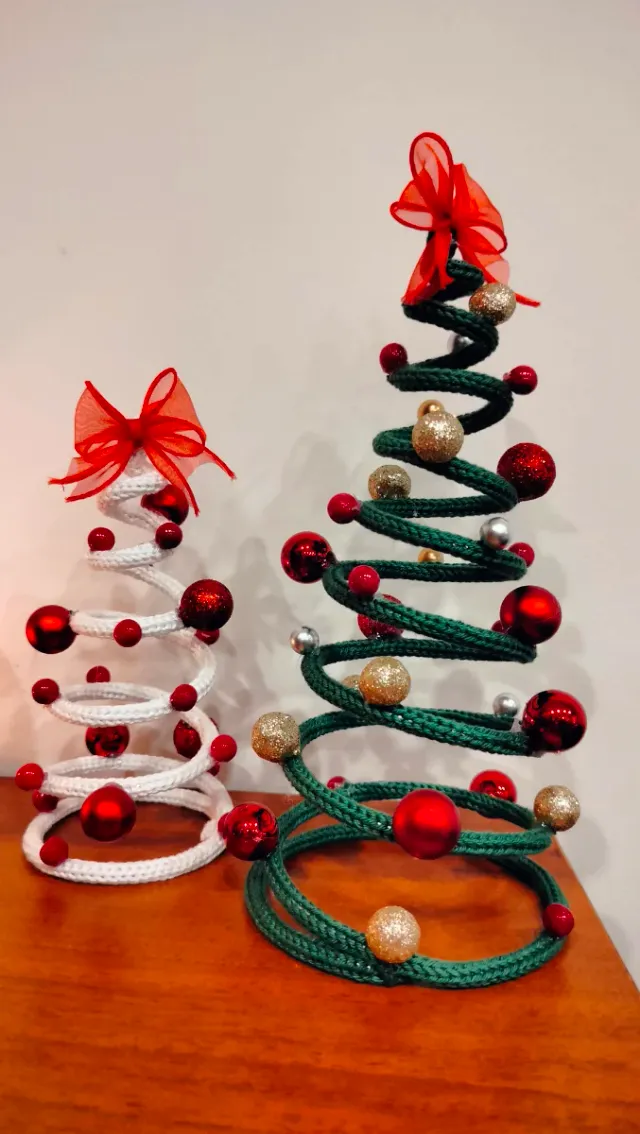 Product detailsSet di due alberelli natalizi decorativi realizzati a mano con tecnica tricotin a spirale. Perfetti per aggiungere un tocco artigianale alla tua casa durante le feste.