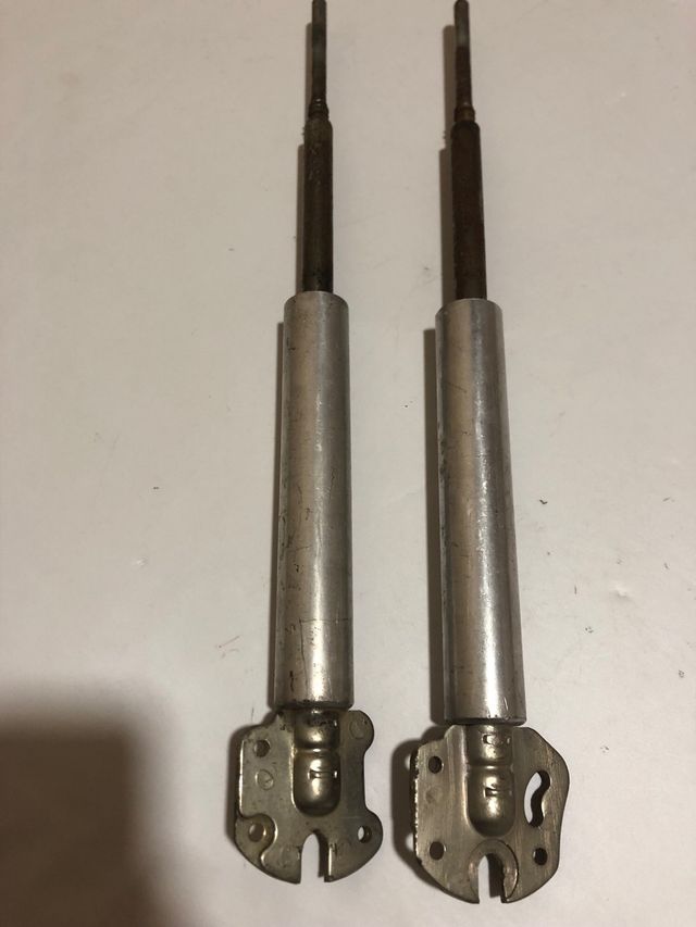 Product detailsPareja de amortiguadores para Mobilette. Se aprecian signos de uso y algo de desgaste en la pintura, pero parecen estar completos.