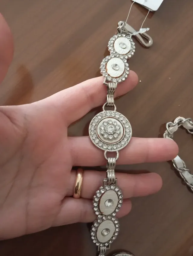 Cintura decorativa con elementi luminosi. (Disponibili altri pezzi di colore bianco e verde.) - Design con strass e pietre. - Chiusura a moschettone. - Catena metallica argentata.