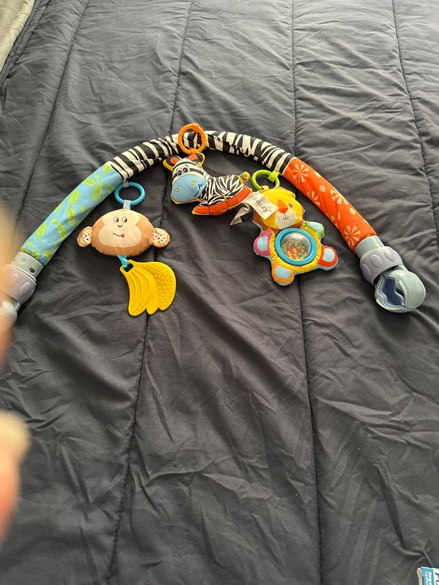 Arco de actividades para bebé con varios juguetes colgantes. - Mono de peluche con plátanos. - Cebra de peluche. - Sonajero con formas de animales.