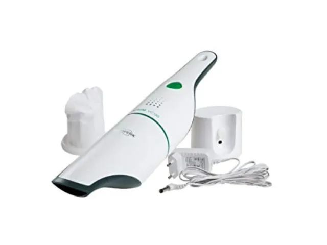 Aspirador de mano Kobold V100 en color blanco y verde. Incluye base de carga y filtro. - Diseño ergonómico. - Ideal para limpiezas rápidas.
