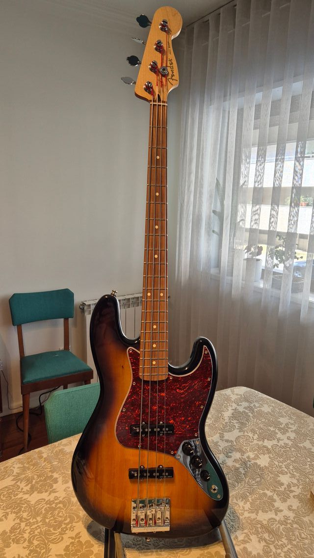Ajuste: Montado y calibrado con cuerdas D’Addario Chrome Flatwound. Muy agradable de tocar, mástil esbelto, resonante, ligero y absolutamente silencioso/neutro. Precio muy competitivo para una Fender "alternativa" sin defectos ni problemas. ¡Listo para usar! Se entrega en un estuche rígido Stagg usado.