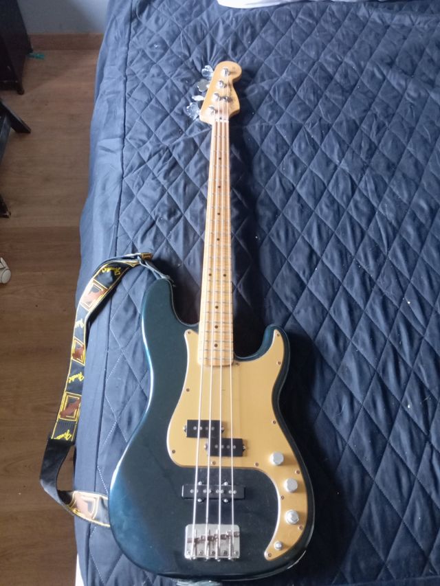 - Golpeador dorado. - Mástil de arce. - Correa - Pastillas P-Bass. - Le falta un botón a un potenciómetro, aunque este funciona a la perfección