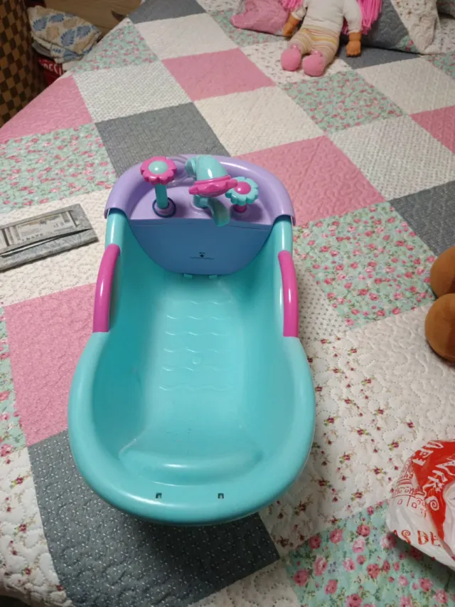 Bañera para muñeca Nenuco en excelente estado, casi sin uso. - Diseño en color turquesa y morado. - Incluye accesorios decorativos. - Asas laterales en color rosa.