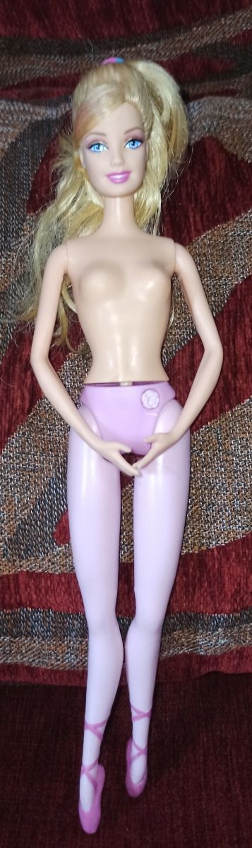 Muñeca Barbie bailarina con un atuendo rosa. - Zapatillas de ballet rosas. - Mallas rosas. - Cabello rubio recogido en coleta.