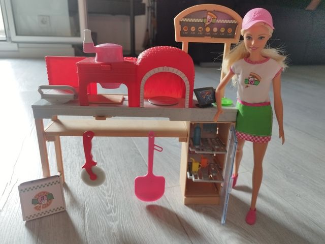 Vendo muñeca Barbie con el set de pizzería con todos sus accesorios para crear deliciosas pizzas.