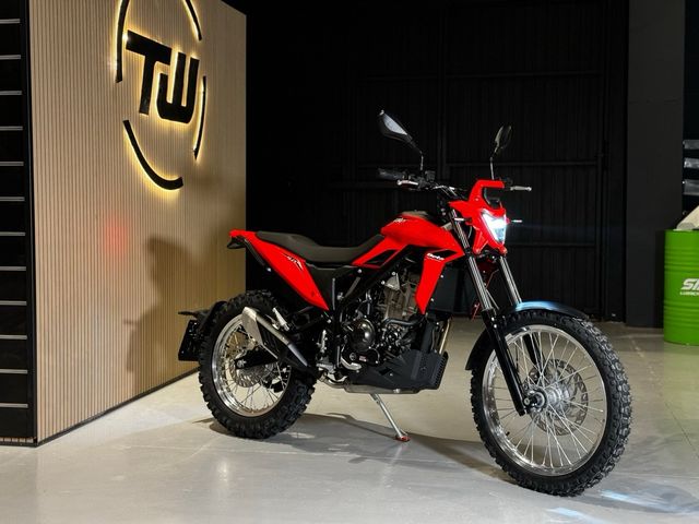 Moto de trail ligera con motor 4T de 350cc con arranque electrico refrigerado por aire, biplaza, con pantalla TFT y un enfoque de uso 50% carretera 50% offroad.