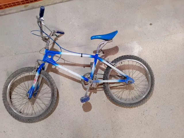 Bicicleta BMX Panther de estilo antiguo, con un diseño llamativo en azul y blanco. - Cuadro de BMX. - Ruedas de 20 pulgadas. - Asiento azul. - Pedales azules.