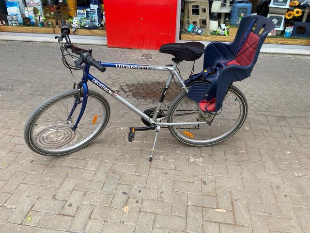 Bicicleta de montaña con silla para transportar a un niño pequeño. - Color azul y plateado. - Silla de seguridad para niño. - Ruedas de 26 pulgadas.