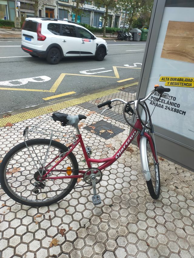 Bicicleta de dama en color rojo. - Cuadro de bicicleta. - Rueda delantera. - Rueda trasera. - Sillín. - Manillar. - Pedales. - Cadena. - Guardabarros delantero.