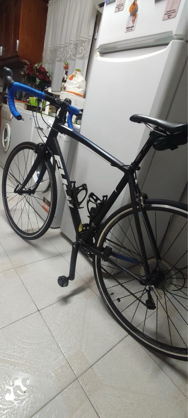 Bicicleta de estrada em bom estado, pronta para pedalar. - Guidão com fita azul. - Ciclocomputador com display digital.
