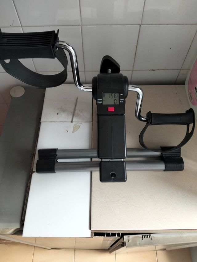 Bicicleta estática compacta para ejercitar piernas y brazos. - Pantalla digital con contador. - Pedales con correas de sujeción.