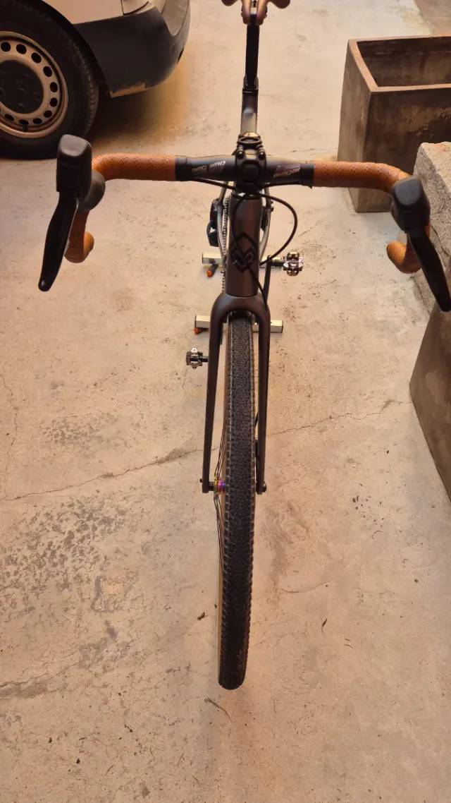 Product detailsBicicleta de gravel con manillar curvo y cubiertas todoterreno.