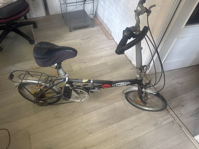 Bicicleta plegable, ideal para desplazamientos urbanos y fácil de guardar. - Cuadro de metal. - Ruedas de 20 pulgadas. - Sillín acolchado. - Portabultos trasero.