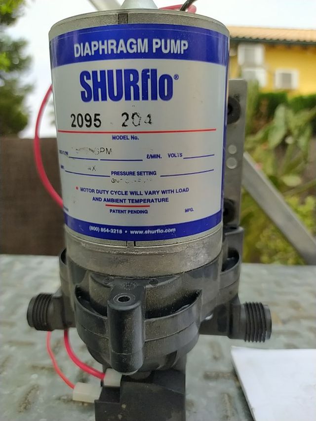 Product detailsBomba para servicio de agua potable en autocaravanas , campers, barcos etc Marca SHURFLO. Con instrucciones de instalación y uso en castellano. Sólo se ha usado una semana. 12 voltios, 7 litros por minuto, 20 psi. Product measurements