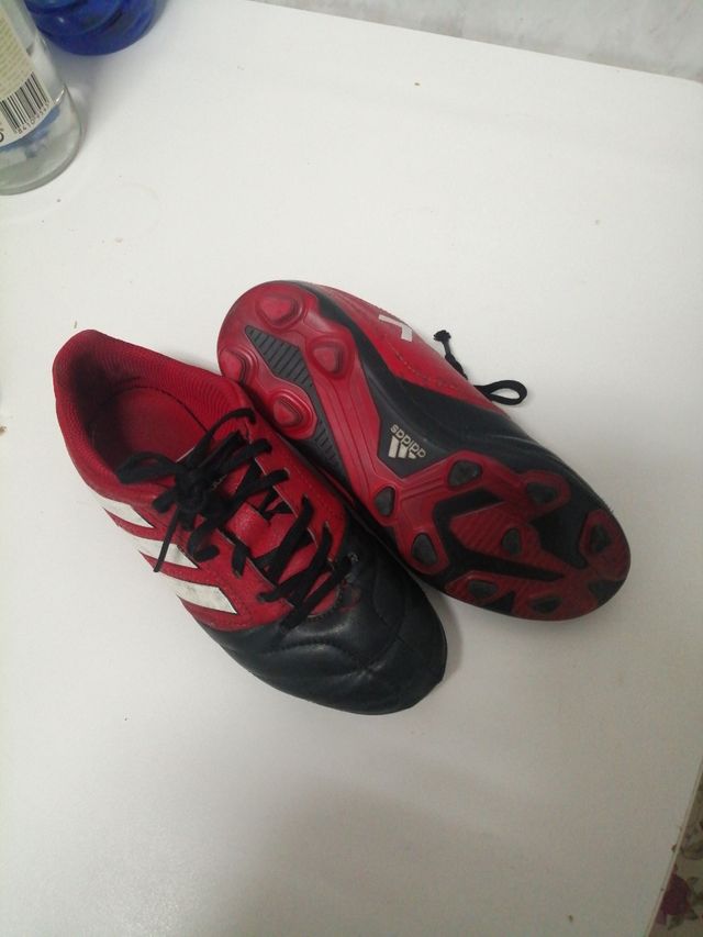 Botas de fútbol Adidas en color rojo y negro. Perfectas para jugar en césped. - Diseño deportivo. - Cierre con cordones. - Suela con tacos.