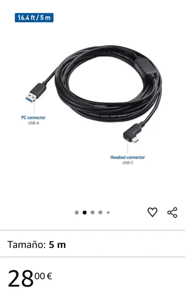 Cable de conexión para Meta Quest, ideal para PCVR. Tiene una longitud de 5 metros. - Conector USB-A para PC. - Conector USB-C para headset. - Longitud: 16.4 ft / 5 m.