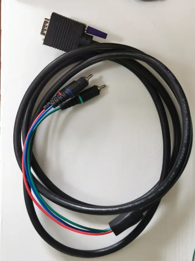 Cabo de vídeo VGA para RCA, ideal para conectar dispositivos. Em excelente estado. - Conector VGA de 15 pinos. - Conectores RCA (vermelho, verde, azul). - Cumprimento: 2mts