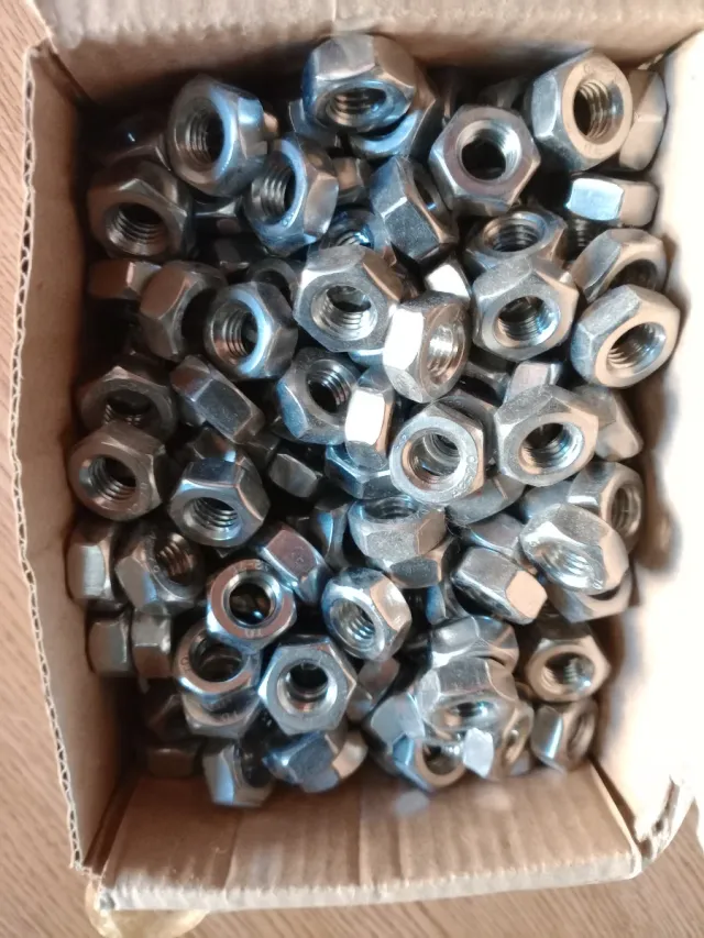 Caixa com 177 porcas M10 em aço inoxidável. - Material: Aço inoxidável - Tamanho: M10 - Quantidade: 177 unidades
