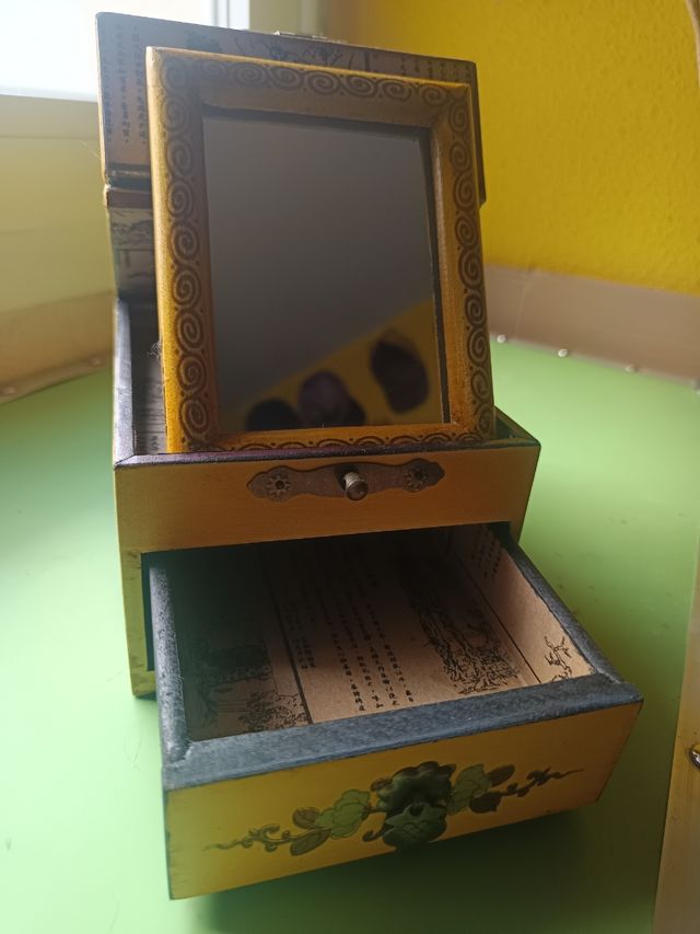 #joyero #vintage #antiguo #oriental #caja #espejo #amarillo #decoracion #joyas #chino #hechomano #madera