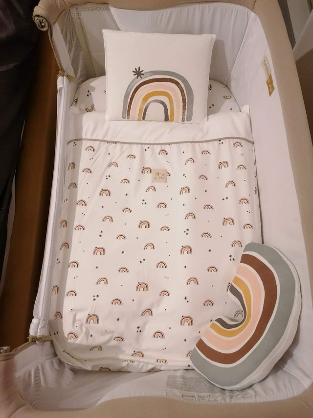 Cama de bebé Next to me com um conjunto de roupa de cama e almofada com padrão de arco-íris. - Inclui colchão em optimo estado.