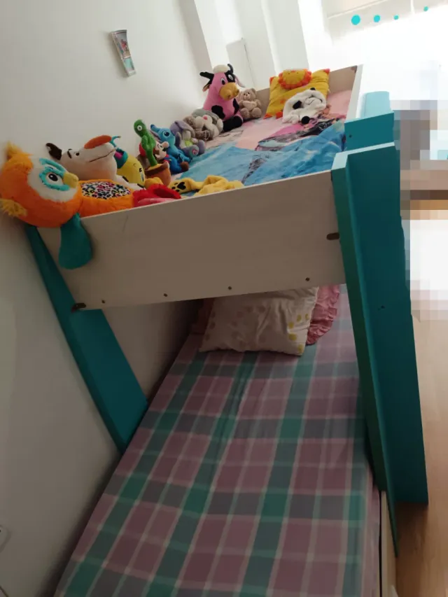 Cama tren para habitación infantil, ideal para aprovechar el espacio. - Estructura de madera. - Diseño moderno y funcional. - Incluye barrera de seguridad.