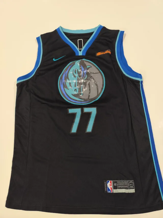 Camisola da NBA da equipa Dallas Mavericks, número 77 - Luka Dončić - Cor preta com detalhes em azul. - Logo da equipa no peito. - Design sem mangas.