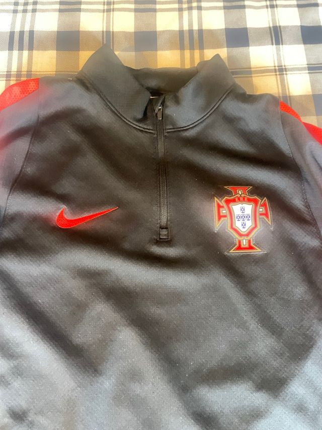 Camisola de treino da Nike, Seleção Portuguesa. - Cor preta com detalhes vermelhos. - Fecho parcial no pescoço. - Logo da Nike em vermelho.