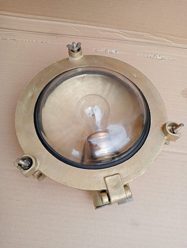 Candeeiro antigo em latão e vidro. - Design de inspiração náutica. - Estrutura robusta em latão. - Tampa de vidro protetora.
