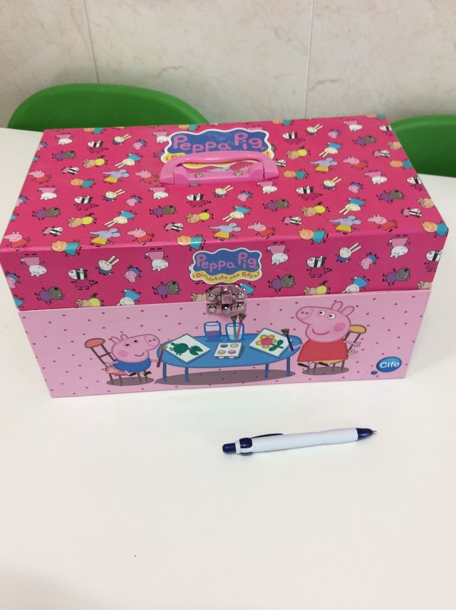 Product detailsCofre-caja de Peppa Pig, de cartón rígido con adornos plastificados. Perfecta para guardar material escolar, apertura tipo cofre y con y con cajón extraible. En su interior marcas de lápices de colores.