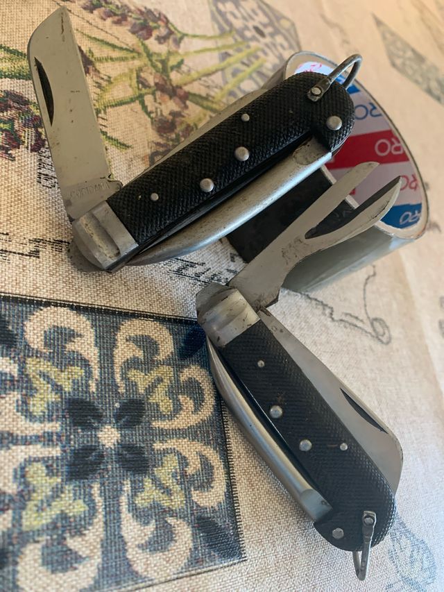 2 Coltellini Coricama con manico nero. - Lama in acciaio. - Manico con rivetti. - Anello per aggancio. von sciogli nodi , marina militare, anni 45/50.