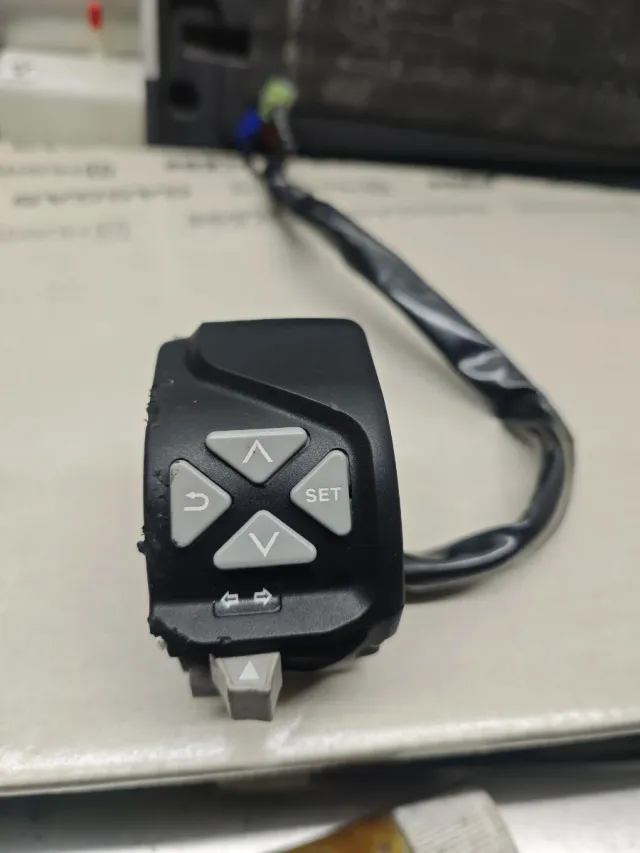 Comando para Ktm Duke 125 y 390. Pieza de plástico negro con botones grises. - Botones con símbolos de flechas, 'set' y retroceso. - Cableado incluido. Funciona perfeito