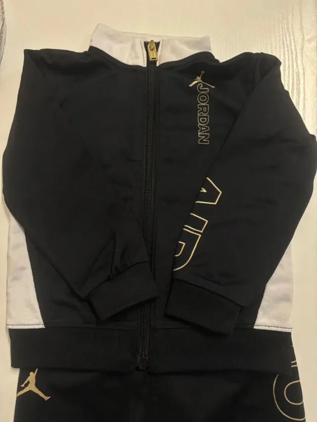 Completo tuta Jordan per neonato, taglia 24 mesi. Perfetto per i più piccoli. - Tuta sportiva Jordan. - Colore nero con dettagli oro e bianco. - Zip frontale.