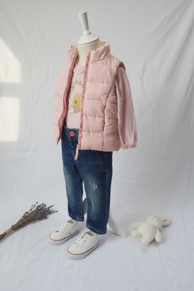 Conjunto de tres piezas para niña. Muy poco uso. - Chaleco acolchado rosa. - Camiseta con estampado de Winnie the Pooh. - Pantalón vaquero azul.