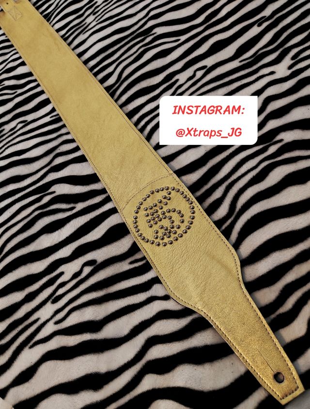 Product detailsCorrea de guitarra o bajo hecha a mano en cuero de cabra dorado y vacuno negro