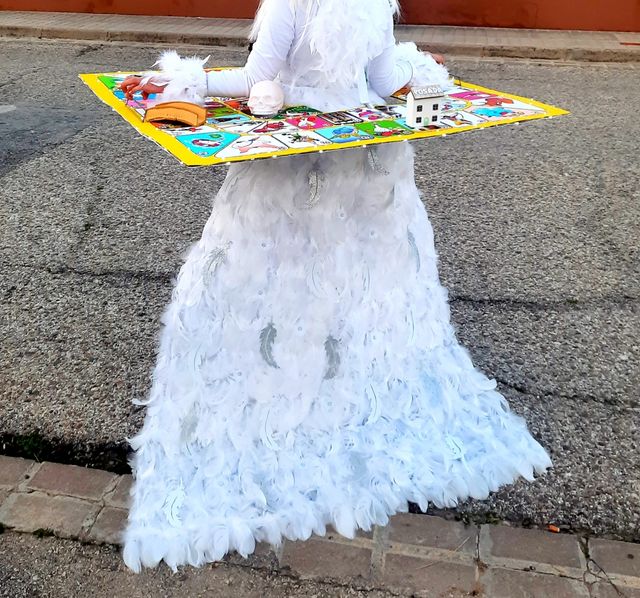 Product detailsDisfraz juego de la oca o reina oca. Se puede poner por separado. Ganador de premio infantil. Contiene maillot, cola de plumas, tocado, falda de flecos, colgante, etc. Es un disfraz espectacular y único. El tablero incluye posada, pozo, calavera que se ilumina, dados y coches de salida. Se envía desmontado por cuestión de medidas pero se puede poner cartón rígido debajo para elaborarlo. Se regala peluca y guirnalda de luces. Aproximadamente 10 años, unos 140 centímetros. Ideal para fiestas y carnavales.