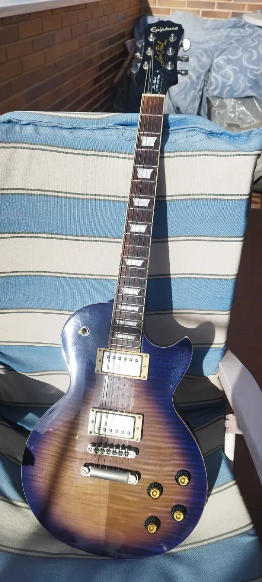Product detailsGuitarra eléctrica Epiphone Les Paul Standard del año 2014. Presenta un acabado degradado de azul a madera.