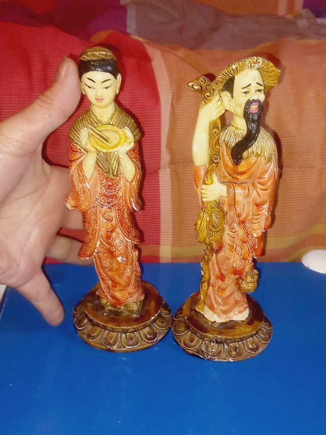 Estatuetas representando figuras culturais asiáticas. A figura à esquerda segura um objeto que se assemelha a um prato ou bacia, enquanto a figura à direita segura um cajado e tem uma barba proeminente.