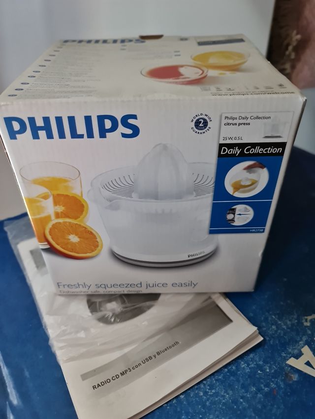 Exprimidor de cítricos Philips Daily Collection. - Modelo HR2738. - Potencia de 25W y capacidad de 0.5L. - Diseño compacto y apto para lavavajillas.