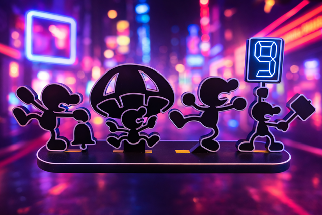 Conjunto de figuras coleccionables de Game & Watch. - Personajes icónicos de Nintendo. - Diseño en silueta negra. - Base de exhibición incluida.