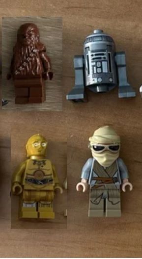 Colección de figuras Lego de Star Wars. - Figura de Chewbacca. - Figura de R2-D2. - Figura de C-3PO. - Figura de Rey.