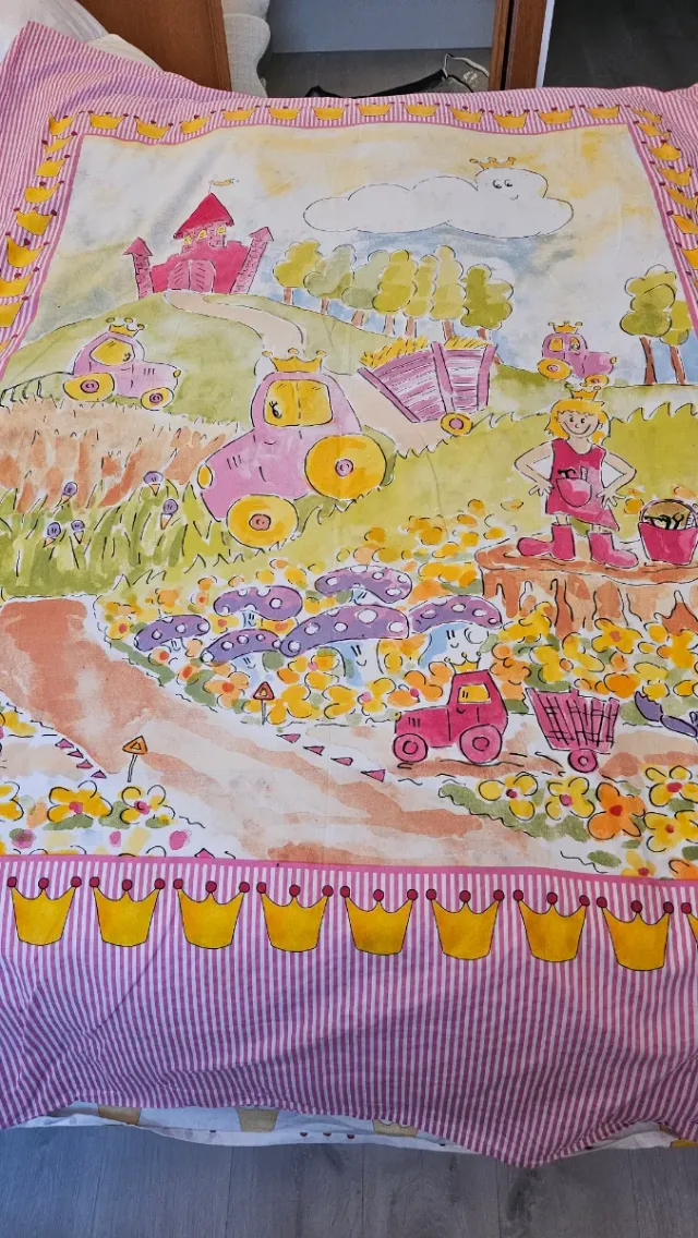 Product detailsFunda nórdica infantil con un alegre diseño de princesas, castillos y tractores rosas. Perfecta para la cama de 90 cm.