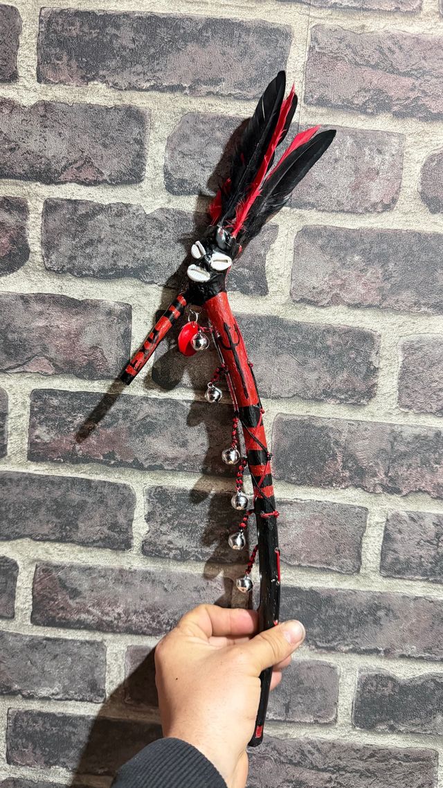 Este garabato no es decoración, es presencia. Hecho a mano y trabajado con intención, representa a Eleguá, dueño de los caminos, mensajero entre mundos y guardián del destino. El rojo y el negro marcan equilibrio, apertura y protección. Las plumas simbolizan comunicación espiritual; los cencerros anuncian su paso y activan el movimiento; los caracoles contienen la palabra y la visión. La madera sirve como soporte vivo de la energía. La pieza está preparada para despertar en la ofrenda, lista para ser presentada y atendida. Cada garabato es único, porque ningún camino se repite.