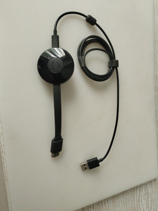 Dispositivo de streaming Google Chromecast. - Diseño compacto y elegante. - Cable HDMI integrado. - Conexión USB para alimentación.
