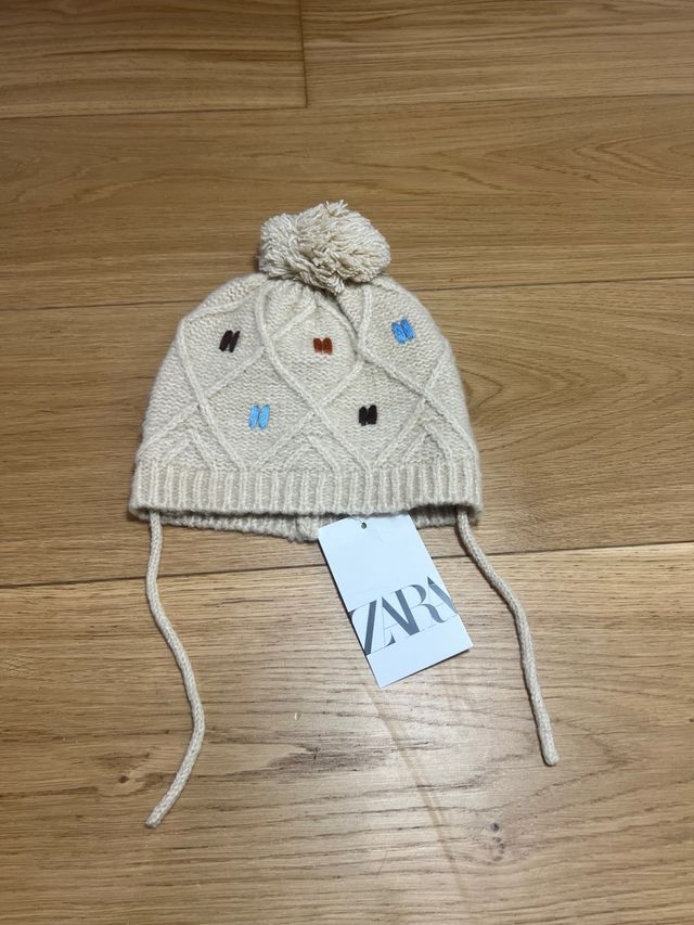 Gorro punto bordados con pompón. Color arena, talla 1-3 años 50 cm,de Zara. Nuevo con etiquetas