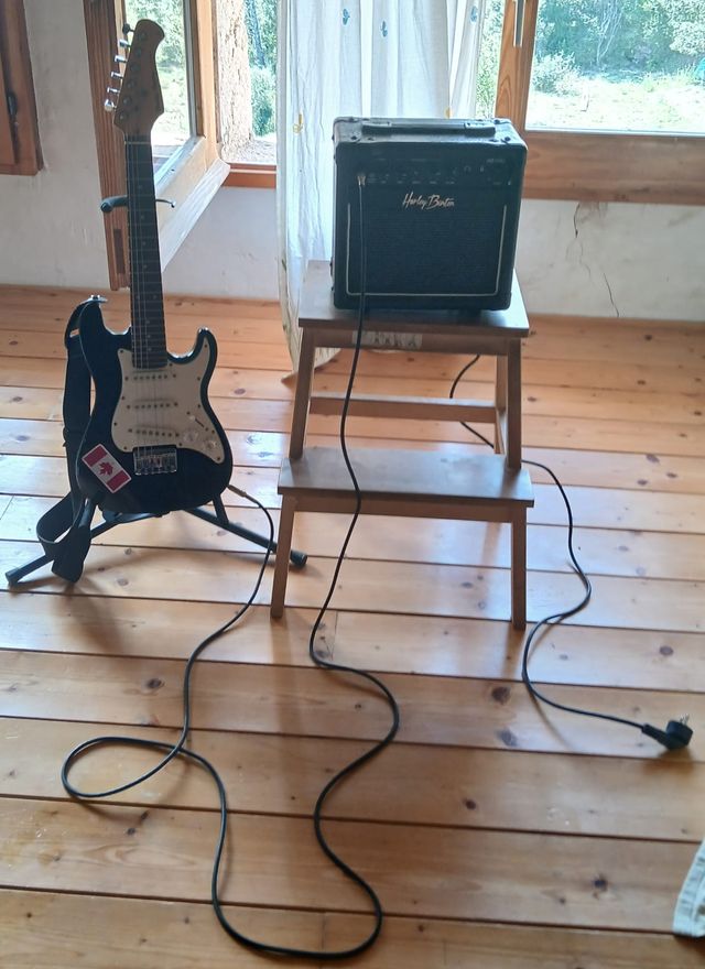 Product detailsGuitarra eléctrica Harley Benton, talla juvenil, funda acolchada y cremallera en buen estado, amplio, cables y pie de soporte.