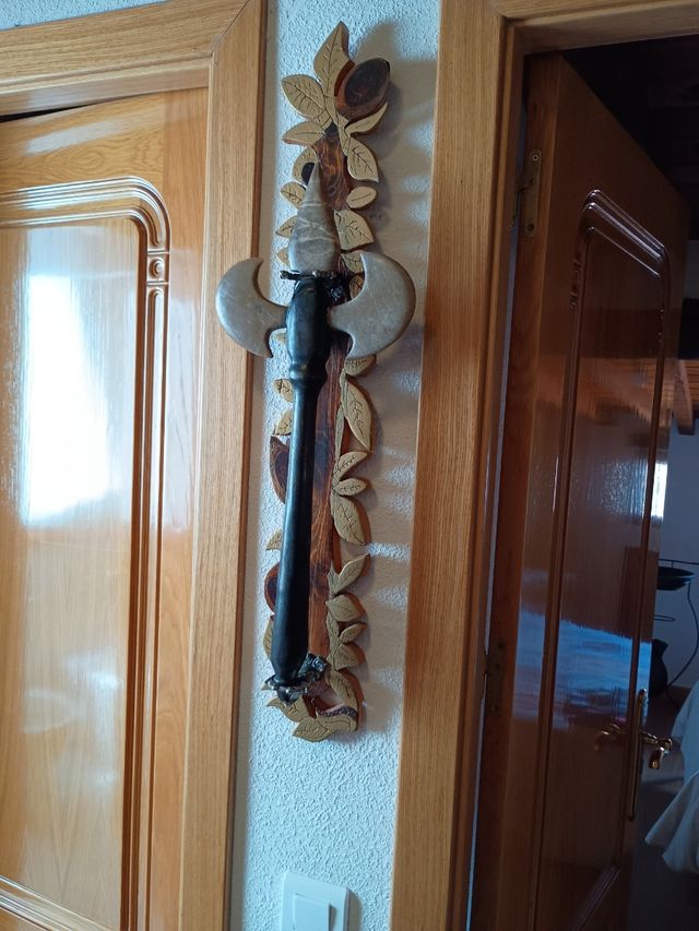 Preciosa hacha decorativa, ideal para coleccionistas. Esta pieza única combina la belleza de la piedra con la calidez de la madera.